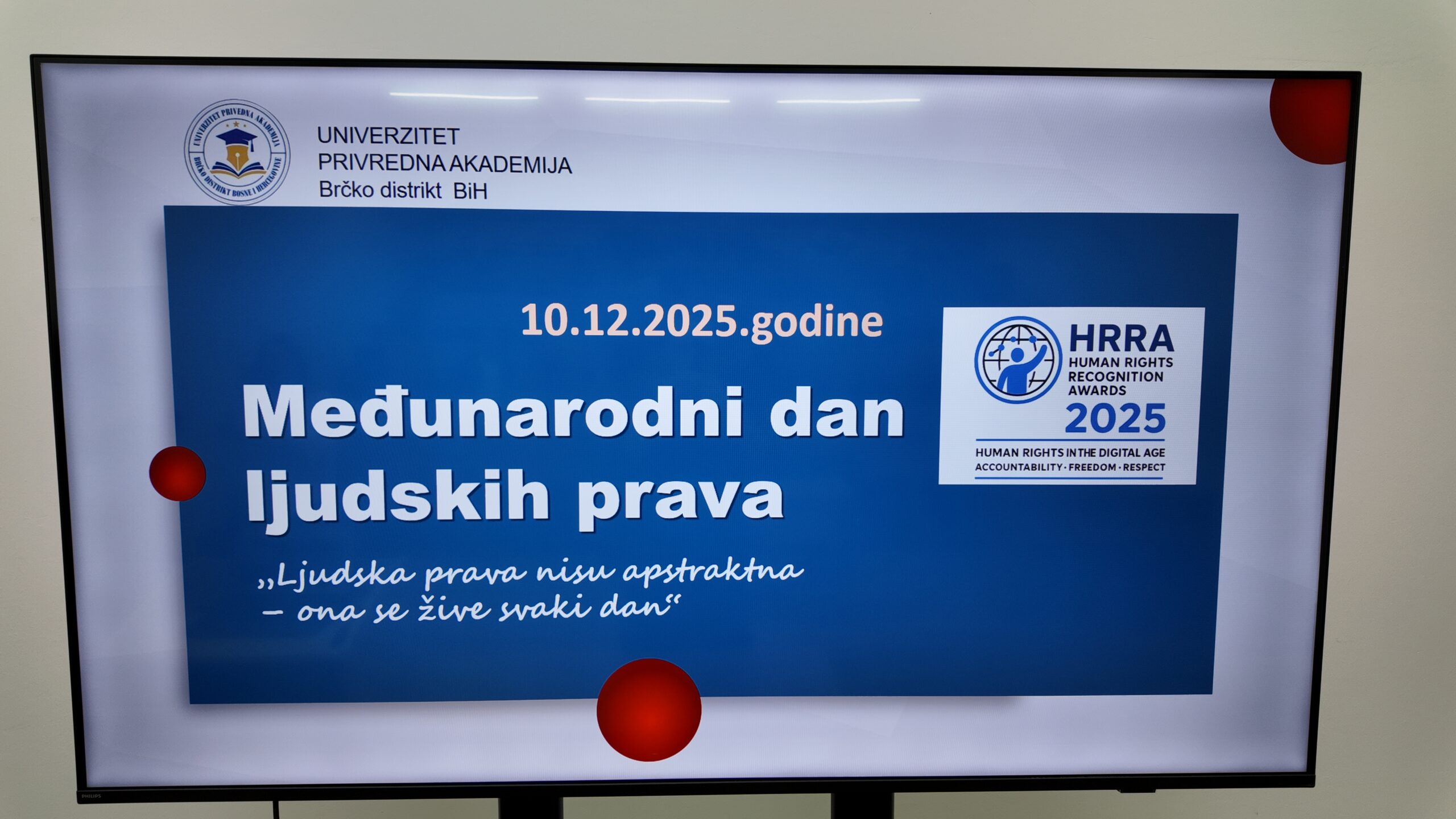 Povodom 10. decembra, Međunarodnog dana ljudskih prava, Univerzitet „Privredna akademija“ Brčko distrikt BiH je organizovao predavanje namijenjeno studentima, uz učešće članova Alumni zajednice. Događaj je okupio alumniste koji danas djeluju u različitim profesionalnim oblastima, a koji su sa studentima podijelili iskustva iz prakse i razgovarali o savremenim izazovima u zaštiti i promociji ljudskih prava.