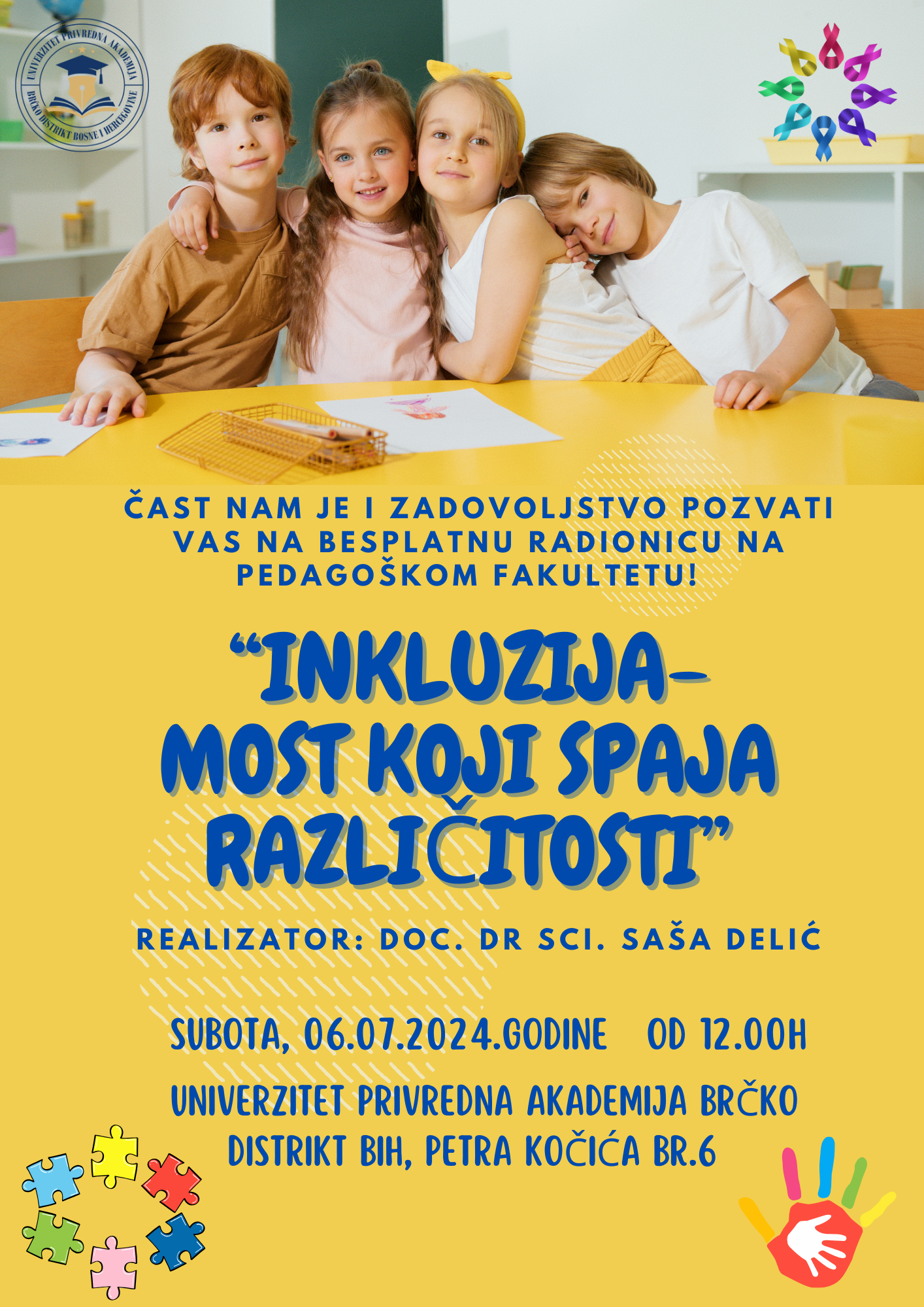 Poštovani, S velikim zadovoljstvom Vas pozivamo na besplatnu radionicu: “Inkluzija-Most koji spaja različitosti”, koja će se održati 06.07.2024. godineu sa početkom od 12.00h u prostorijama Univerziteta “Privredna akademija” Brčko...